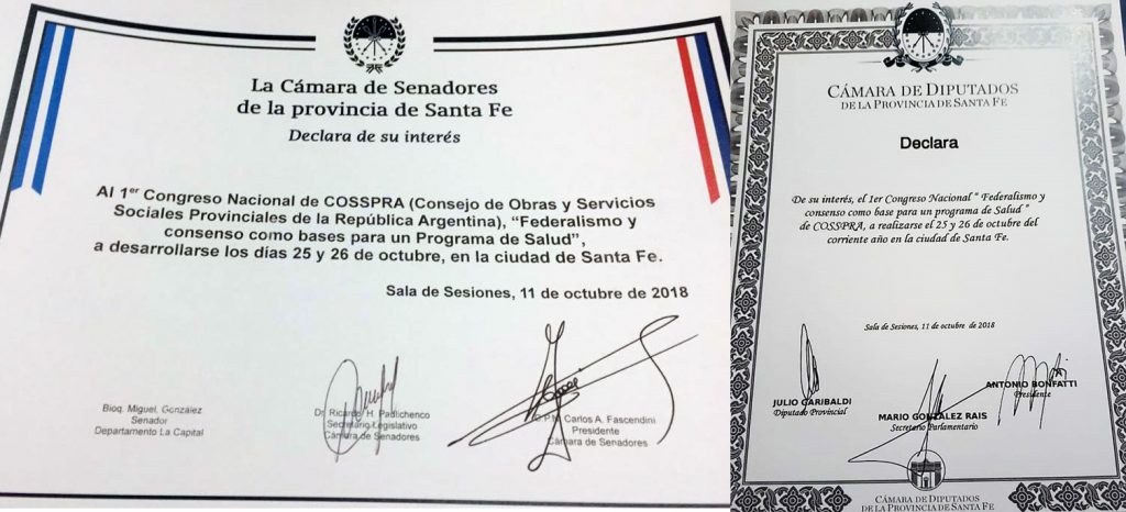 Tanto la Cámara de Senadores como la de Diputados de la provincia de Santa Fe declaró, este 11 de octubre, “De Interés” para ambos organismos, el encuentro que desarrollará el Consejo de Obras y Servicios Sociales Provinciales de la República Argentina y que espera convocar a más de 300 participantes del ámbito de la salud.