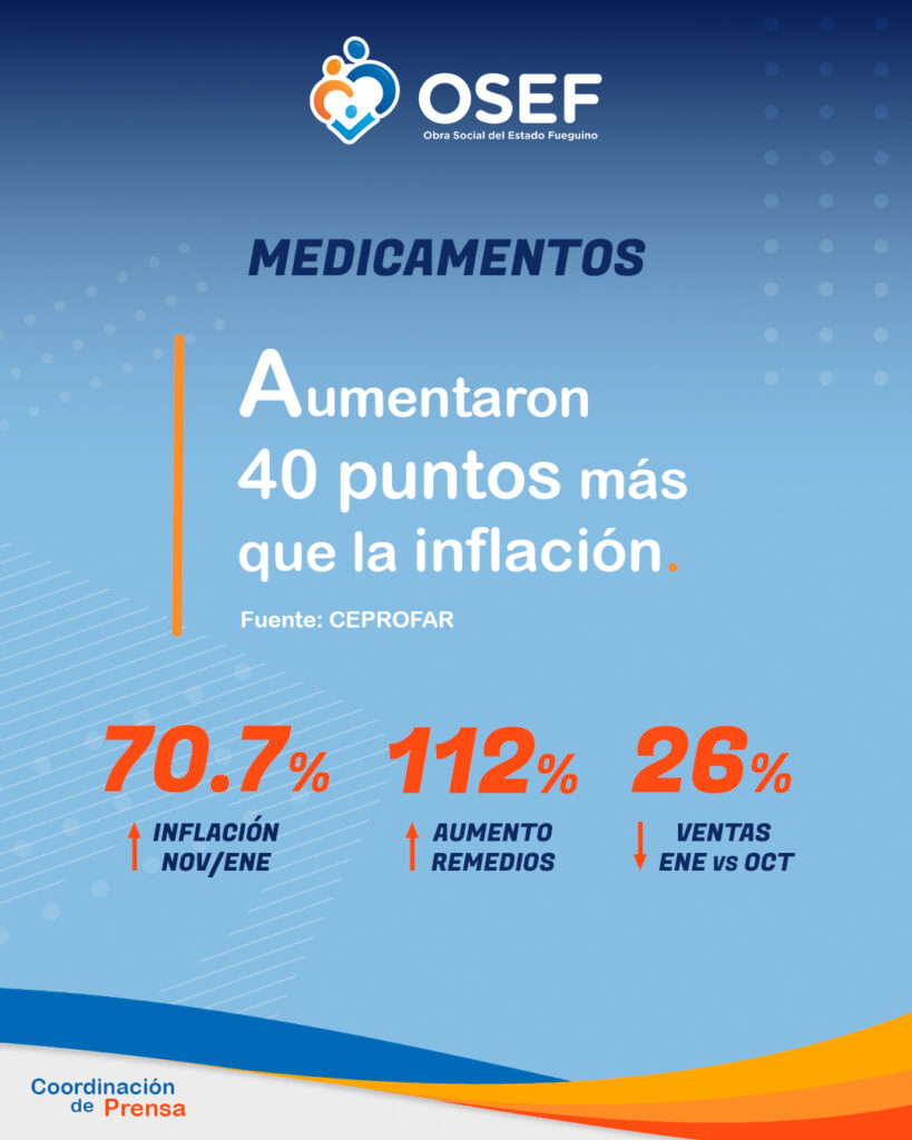 La Obra Social del Estado Fueguino compartió datos publicados por el Centro de Profesionales Farmacéuticos Argentinos (CEPROFAR) que mencionan los alarmantes datos estadísticos del último trimestre acerca del aumento del valor de los medicamentos.