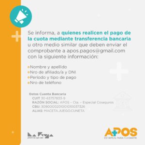 APOS informa que quienes realicen el pago de la cuota mediante transferencia bancaria u otro [...]