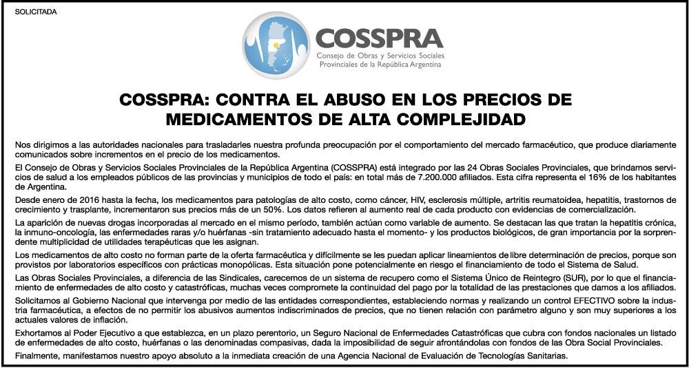 “Solicitamos al Gobierno Nacional que intervenga por medio de las entidades correspondientes, estableciendo normas y realizando un control efectivo sobre la industria farmacéutica, a efectos de no permitir los abusivos aumentos indiscriminados de precios, que no tienen relación con parámetro alguno y son muy superiores a los actuales valores de inflación”, denuncia COSSPRA. Y agrega: “Exhortamos al Poder Ejecutivo a que establezca, en un plazo perentorio, un Seguro Nacional de Enfermedades Catastróficas que cubra con fondos nacionales un listado de enfermedades de alto costo, huérfanas o las denominadas compasivas, dada la imposibilidad de seguir afrontándolas con fondos de las Obra Social Provinciales”.
