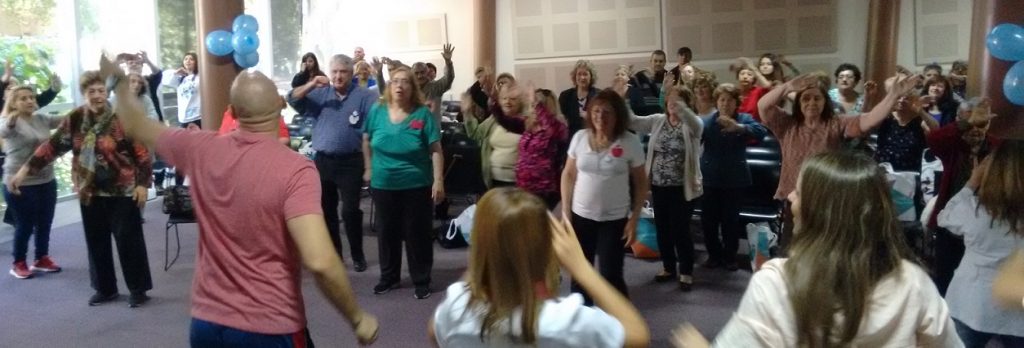 A continuación, el profesor de Educación Física Mariano Basigalup puso a los asistentes en movimiento y brindó una clase de Gimnasia acompañada de pasos de baile, destacando la importancia de la actividad en el paciente así como el buen humor.