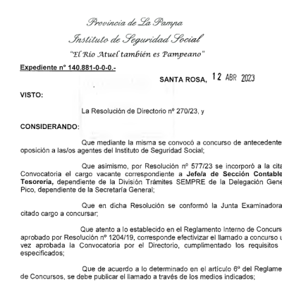 Por Disposición N° 4/23 se efectúa el llamado a Concurso de Antecedentes y Oposición a las/os agentes del Instituto de Seguridad Social, para cubrir el cargo vacante correspondiente a Jefe de Sección Contable y Tesorería, dependiente de la División Trámites SEMPRE de la Delegación General Pico, de la Jurisdicción 1 -Secretaría General-, de este Organismo.