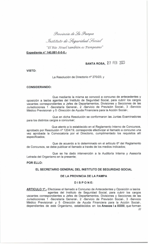 A través de la Disposición Nro 1/23 se efectúa el llamado a Concurso de Antecedentes y Oposición a las/os agentes del Instituto de Seguridad Social, para cubrir los cargos vacantes correspondientes a Jefes de Departamentos, Divisiones y Secciones de las Jurisdicciones 1 -Secretaría General-, 2 -Servicio de Previsión Social-, 3 -Servicio Médico Previsional- y 5 -Dirección de Ayuda Financiera para la Acción Social-, dependientes de este Organismo.