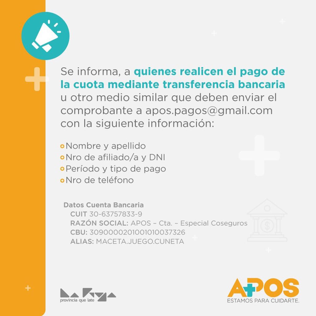 APOS informa que quienes realicen el pago de la cuota mediante transferencia bancaria u otro medio similar, deben enviar el comprobante a apos.pagos@gmail.com con la siguiente información: