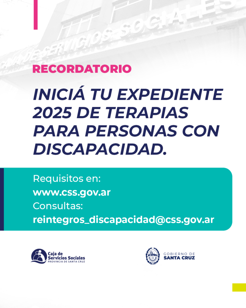 Con el objetivo de garantizarle a los beneficiarios que tengan continuidad terapéutica durante el próximo año, la obra social publicó en su página web los requisitos para iniciar el expediente. Los mismo también pueden solicitarlo al correo reintegros_discapacidad@css.gov.ar o acercarse a delegaciones para mayor información.