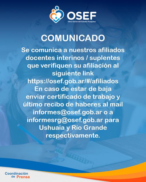 La Obra Social del Estado Fueguino comunica a sus afiliados docentes interinos / suplentes que verifiquen su afiliación al siguiente link https://osef.gob.ar/#/afiliados