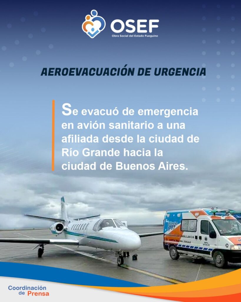 El traslado, realizado de urgencia por la empresa Aerovida en articulación con Clínica Cempe, fue para poder llevar a una afiliada desde Río Grande a la Ciudad de Buenos Aires.